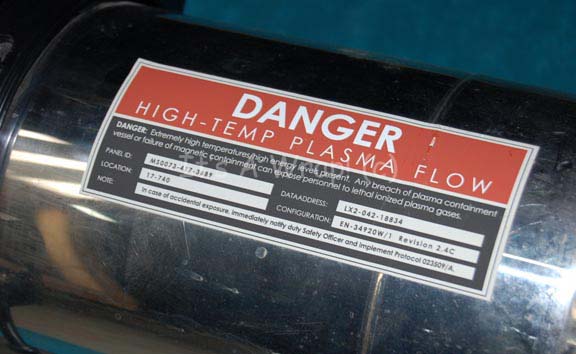 Description: A piece of set dressing featured within armory scenes in various episodes of Star Trek: Enterprise. This item is a large, polished metal, capsule-shaped “plasma container” and was part of a collection of similar containers which were affixed to a wall in the set; all able to be disconnected from their corresponding wall mounts through the use of a latch which wraps around the container. The item features a trio of graphical applications; a ‘danger’ style triangle colored red and white, two matching rectangular inventory style applications featuring red warning labels reading ‘Danger, High-Temp Plasma Flow’ with instructions about how to handle ‘exposure’, and a warning about the ‘dangerous’ elements held within. Even though the container never held anything that we know of it maintains a top mounted screw on cap which when removed reveals a closed opening, covered over with black grip tape. The item measures approx. 22.5 X 9 X 9 inches when connected.