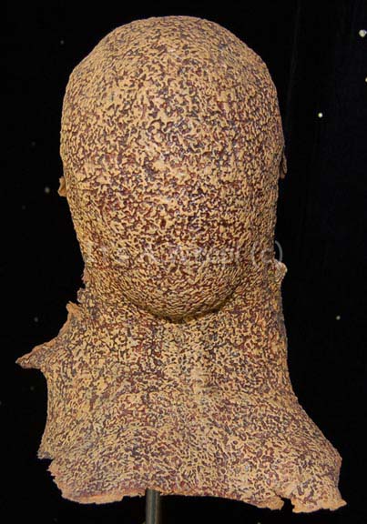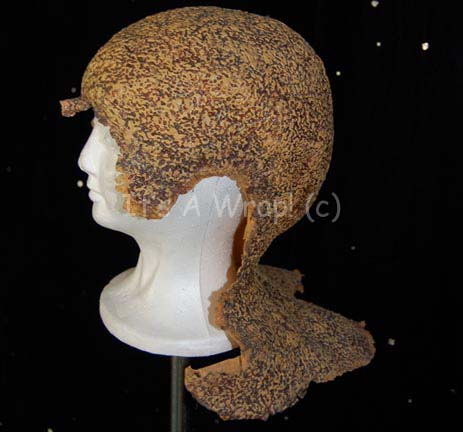 Description: A special effects make-up full head wrap intended to be an adult Suliban appearing variously in episodes of Star Trek: Enterprise. The item is molded foam rubber made to appear blotched and painted brown with a topcoat of tan. The item is in good condition overall with a supple feel generally, the edges of the item are in good condition with generally dry areas.