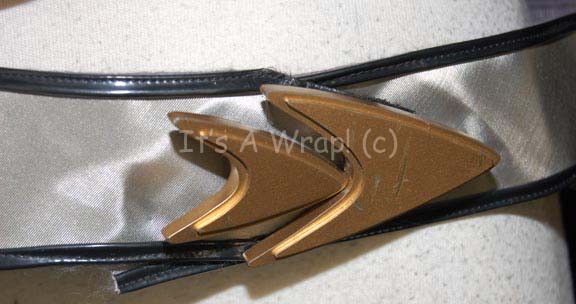 Description: A wardrobe accessory featured in the Star Trek: The Next Generation episode “Yesterday’s Enterprise” for wear by Starfleet officers and crewmen in the alternate reality created by the emergence of the “U.S.S. Enterprise-C” from a temporal anomaly. The item is a reflective silver colored vinyl belt with black vinyl trim that features a matching over the shoulder strap with two molded resin Starfleet emblem badges attached via Velcro at the waist. The badges are painted metallic gold with a minor amount of wear from time and storage conditions; there are multiple inscriptions on the inner lining indicating use by various actors.