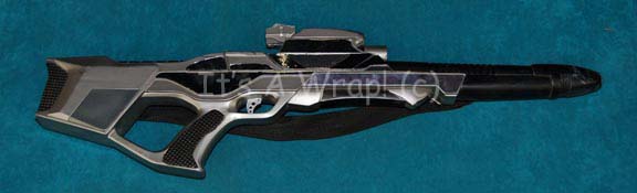 Description: A prop Starfleet Type III Mark III phaser rifle made specifically for Star Trek X: Nemesis. The item is a solid cast resin prop energy weapon painted metallic gunmetal with metallic chrome colored adhesive applications, a black painted muzzle, textured grips and butt stock, a broken ‘sighting scope’, a cavity for a flashlight, and a black nylon shoulder strap fixed in a static position. The accompanying flashlight is a ‘Surefire’ name brand light with a twist activation and a thumb button activation on the end. The light is powered by two Surefire name brand SF123A sized 3volt batteries held internally which retain power from production use and are very bright! The item measures approx. 10.25 X 33 X 2 inches and depicts only the slightest of scuffs on the barrel end and a few chips in the paint on the butt stock edges.