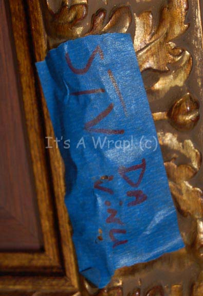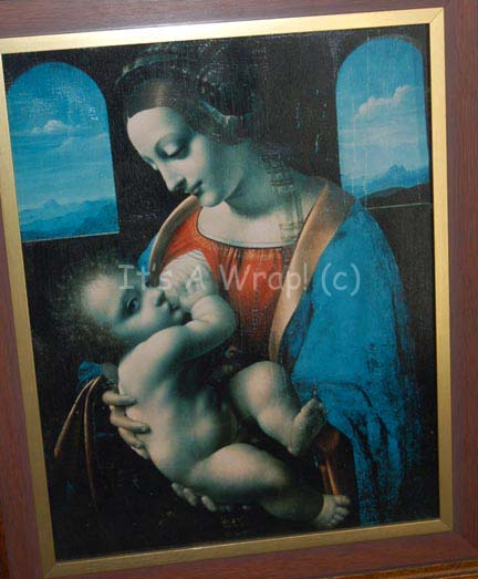 Description: An excellent prop painting of “The Madonna Litta” from episodes of Star Trek: Voyager featuring the holographic character “Leonardi Da Vinci” (John Rhys Davies). The item is a print of the portrait mounted on a wooden back and mounted within a very nice frame. The frame features painted embellishments and a gold colored metal trim around the painting itself. The item measures approx. 22.25 X 25.75 X 1.75 inches and features hand written inscriptions reading ‘STV Da Vinci’ on the reverse and a blue adhesive tape label on the face of the frame reading the same.
