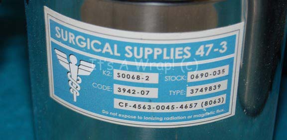 Description: A lot of two similarly fashioned metal jars with clear plastic lids appearing variously as set dressing on the set of the “Enterprise NX-01” in episodes of Star Trek: Enterprise. The items feature attached, hinged lids with flip latch seals and both are adorned with blue and white themed Starfleet inventory applications that depict white cadesus graphics. One label reads ‘Med Research Equip’, the other reads ‘Surgical Supplies 47-3’. The items measure approx. 5 X 5.25 inches diameter and 6.5 X 5.25 inches diameter.