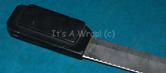 Description: A cake cutting knife believed to have been a B-unit prop or a prospective prop for use in the Star Trek: The Next Generation episode “Phantasms”. Indeed the knife features the same molded resin handle as other props from the episode and the same length. The item is an actual metal blade with a serrated edge and quite sharp. The end is cut diagonally to a sharp point. The item may have been used in Star Trek episodic television but is not believed to have appeared in “Phantasms”. The item measures approx. 0.5 X 1.5 X 13.25 inches.