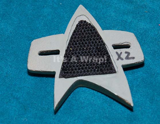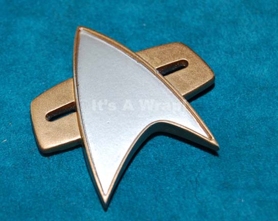 Description: A molded resin Starfleet combadge made in the style first appearing in Star Trek VII: Generations and in the following films, then going on to appear in Star Trek: Deep Space Nine and Voyager. The item is painted metallic gold and silver and the reverse is hollowed out to allow a cavity for a Velcro placement. The reverse is also inscribed ‘X2’. The item measures approx. 2 X 2 inches.