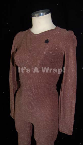 Description: A costume featured in various episodes of Star Trek: Voyager for wear by Jeri Ryan as the ex-Borg “Seven of Nine”. This costume is a brown, long-sleeved, full-length, form-fitting jumpsuit with metallic-silver colored pin striping and sewn in feet that leave the heels exposed. A sewn in Voyager tag reads ‘Jeri Ryan, 10.2000’.