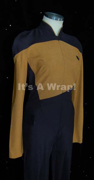 Description: A costume featured in various episodes of Star Trek: The Next Generation. This costume is a Starfleet uniform jumpsuit and features black shoulders with an Operations Gold chest, back, sleeves, and as piping around the Mandarin collar; black waist and legs that end in stirrups, a zip down the front, Velcro placement for a commbadge on the left breast (sold separately) and another on the right thigh for ‘away team gear’. A sewn in tag denotes wear by Teri Noel and reads ’34, 154’.