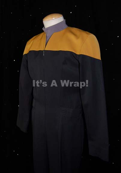 Description: A costume featured in various episodes of Star Trek: Voyager for wear by Shepard Ross in the recurring role of “Ensign Murphy”. This costume is a black Starfleet uniform jumpsuit with Operations Gold division shoulders that zips up the front, clasps half way up the chest, and features a Velcro patch on the left breast for a Starfleet ‘commbadge’ (sold separately). The waist features form fitting black elastic with sewn in loops for ‘away team’ gear, the feet end in black elastic stirrups. Included is a long-sleeved, blue/gray uniform undershirt with a zip down the back. A sewn in Voyager reads ‘Shepard Ross’, another ‘Steven Grothe’ and a third that sets the size at 40; a sewn in Voyager tag in the undershirt reads ‘Rick Evans’ and sets its size at 38.