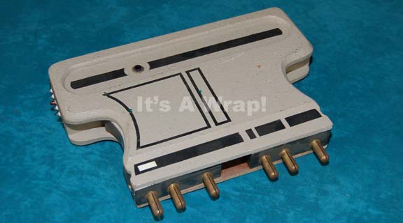 Description: A prop EPI Capacitor featured in the Star Trek: Deep Space Nine episode “Q-Less” for use by “Miles O’Brien” (Colm Meaney) to reenergize and then open a runabout door. The item is a pair of internally mounted tri-prong electrical conduits cased in a wood exterior. The item saw use in the episode by being plugged into the side of the runabout where lights on the top and bottom of the item activated in sequence through the use on an unknown power source. The untested device is painted beige externally with black adhesive detail and a black button. The item measures approx. 11.5 X 9 X 2 inches. A warning application on the side reads ‘When using D.C. do not rupture under load’.