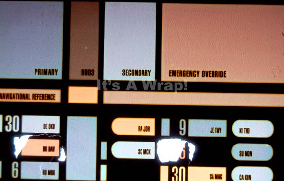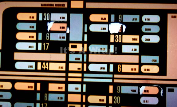 Description: A large sized LCARS style console inset panel like those appearing variously in Star Trek episodic television. The item is a sheet of smoked acrylic with a multi-colored graphical application adhered to the reverse that depict multiple faux buttons, indicators, and readouts with a large attitude and pitch adjustment interface on the left side. The indicator lights and faux buttons feature acronyms meant to represent the names of multiple production personnel and the readouts depict uses such as ‘Navigational Reference’ and ‘Emergency Override’. The item measures approx. 13 X 45 inches with rounded corners and the graphic depicts a degree of damage where specific indicator light boxes were removed prior to the auction. The item is believed to have been part of the "USS Voyager" situation display in the aft of the bridge set.