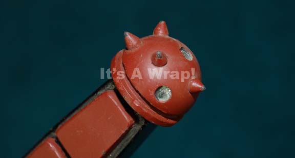 Description: A prop Klingon d’k tagh like those appearing variously in Star Trek episodic television excepting that this one is meant for a camera trick to appear stabbed into a body or actor. The item is made from cast resin painted black, rust red, and metallic silver. The ‘blade’ is cut short from the hand grip to appear stabbed into someone so that the item measures approx. 9.25 X 3.25 X 1 inch. The item is missing the twin guard ‘blades’ common to these props and some of the spikes in the pommel end of the grip.