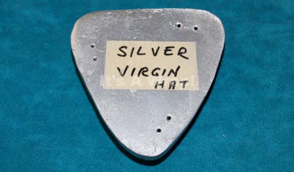 Description: A Vulcan jewelry item like those appearing in Star Trek III: The Search for Spock and Star Trek VI: The Undiscovered Country. The item is a molded paste badge fashioned to be triangular with a metallic silver painted border and a translucent iridescent raised aspect that features a painted on Vulcan iconographic letter. The item features a set of holes for sewing onto a costume and a chip out of the top. The reverse features an adhered label that reads ‘silver virgin hat’. The item measures approx. 2.25 X 2.25 X 2.25 X 0.5 inches.