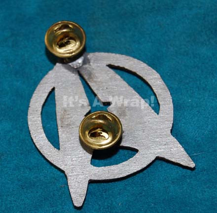 Description: A metal badge like those first appearing in Star Trek II: The Wrath of Khan through Star Trek VII: Generations on the costume uniforms of Starfleet crewmen. The item is molded metal painted metallic bronze on the face with pin backing to affix to a costume. Item measures approx. 2 X 1.75 inches.