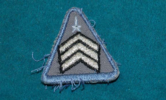 Description: A MACO (Military Assault Command Operations) rank patch created for use in various episodes of Star Trek: Enterprise. The item is a triangular patch colored blue with a white star and three white chevrons indicating the wearer to be a ‘sergeant'. This item would be worn on right sleeve of a uniform top.
