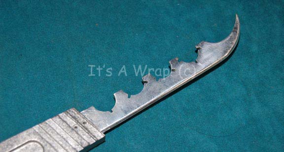 Description: A prop knife like the one appearing the Star Trek: Enterprise episode “Stratagem” for use by “Captain Archer” (Scott Bakula) to cut into the wrist of “Degra” (Randy Oglesby) in removing a Regulan bloodworm. The item is a molded rubber knife with a metal internal framework, the whole item is painted metallic silver; the hand grip is painted to add texture and the whole thing measures approx. 11 X 1.25 X 0.5 inches.
