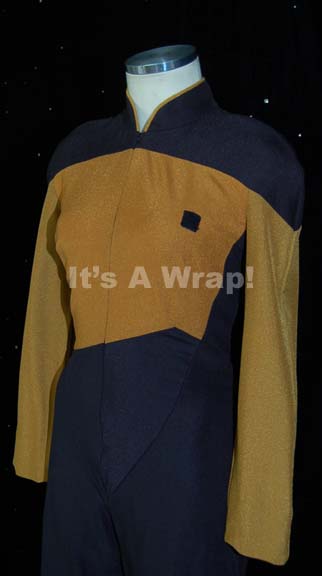 Description: A costume featured in various episodes of Star Trek: The Next Generation. This costume is a Starfleet uniform jumpsuit and features black shoulders with an Operations Gold chest, back, sleeves, and as piping around the Mandarin collar; black waist and legs that end in stirrups, a zip down the front, Velcro placement for a commbadge on the left breast (sold separately). A sewn in tag denotes wear by Marianne Lewis and reads ’34, 45’