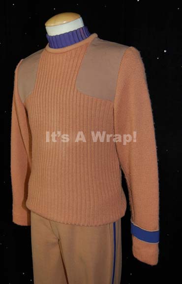 Description: A costume featured in the fifth Star Trek feature film “The Final Frontier”. Ordered to ‘Nimbus III', the “Enterprise-A” crew responds to a hostage crisis in these commando-style field duty uniforms; this long-sleeved, caramel-colored uniform sweater is made from 100% wool with polyester and cotton patches over the shoulders and a Security purple division strip around the left cuff. Matching trousers are clasp and zipper sealed and feature corresponding purple strips down the outside seam of both legs. Included is a matching, long-sleeved undershirt with a ribbed collar and cuffs, and zip down the back. A pin-backed badge denoting the rank of Ensign is also included; one of the tines on the backing is missing but the other will still hold. This costume represents the last of the “Final Frontier” Commando-style uniforms this located.