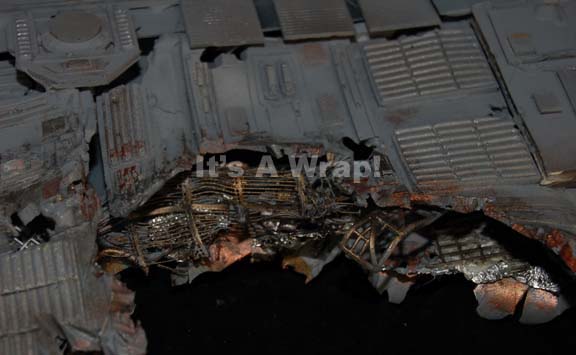 Description: A model piece created to appear as starship wreckage in Star Trek episodic television. The item is composed of multiple components including kitbash model pieces, sheet plastic, wire mesh, and foam backing all positioned together to appear as larger than they are in reality as a camera effect. The item is brushed with metallic paint schemes and the components are warped to appear ‘damaged’ with the wire mesh bending out to appear ‘exploded’. The item is painted in the color scheme of Starfleet and the item measures approx. 13.25 X 7.5 X 1.5 inches.