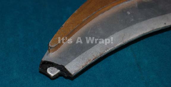 Description: A prop knife like those appearing variously in episodes of Star Trek: The Next Generation like “Night Terrors” where one was affixed to the wall of “Worf’s” (Michael Dorn) quarters wall. The item is molded rubber on a metal internal framework painted brown on the hand grip, metallic gold and metallic silver on the ‘blade’. The blade is beveled to appear ‘sharp’ and one end of the curved side is broken off revealing the framework inside. The back of the item features a mounted metal hook for wall mounting the item as a display piece. Measures approx. 12.5 X 7.75 x 1 inch.