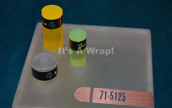 Description: A data rod container like those appearing in the Star Trek: Voyager episode “The Omega Directive” and “Nightingale”. The item is a cube shaped silver colored metal case with a clear acrylic cap on the bottom and a fogged acrylic cap on the top. The top has three differently sized circular openings for the insertion of three acrylic cylinders colored yellow, green, and clear, each cut to differing lengths and all of which are adorned at their end with ‘alien script’. The case itself features metallic copper detail lines one each side excepting the top and bottom, the top features a metallic copper colored Starfleet inventory style application with a numeric value. The item with data rods in place measures approx. 4 X 4 X 6 inches.
