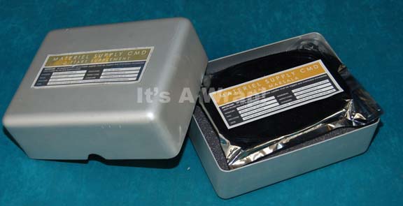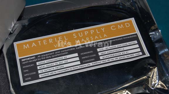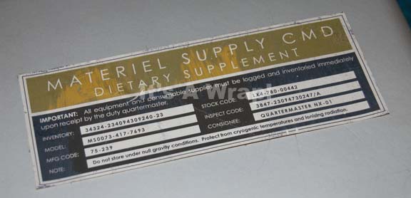Description: A prop appearing variously in episodes of Star Trek: Enterprise. The item is a dual hemispherical box painted metallic silver and fashioned from sheet plastic with a layer of gray foam inside for filler that contains a Starfleet ration pack. The ration pack is made from a static free zip seal bag that contains a faux food dish and is labeled externally for the contents to represent ‘Veal Marsala’ as issued by ‘Materiel Supply CMD’. The label external to the box lid reads ‘Materiel Supply CMD, Dietary Supplement’ and is faded due to time and storage conditions, yet retains its original appearance and legibility. The item measures approx. 3.75 X 9 X 7 inches.