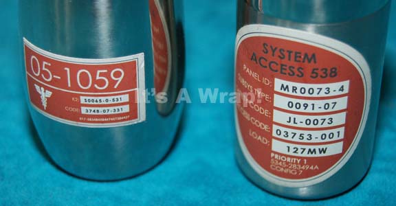 Description: A lot of two different set dressing pieces appearing variously in episodes of Star Trek: Enterprise on the set of the “Enterprise NX-0”1 sickbay. The items are polished aluminum containers with lids. One item has a clear plastic lid, the other a matching metal lid that twists and locks into place. The items both feature red colored Starfleet inventory applications, one with a white medical cadesus