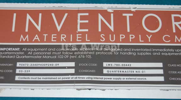 Description: A screen used graphical application like those appearing on Starfleet themed sets in episodes of Star Trek: Enterprise. The item is rectangle shaped with rust red and black base colors. The item reads ‘INVENTORY, Material Supply Command’ and features multiple important protocols written realistically. The item was carefully removed from a set piece prior to set strike and had been applied to a painted backing so the paint is still present on the adhesive side. The item is presented on white coated paper allowing for ease of removal. The item measures approx. 9.75 X 3.75 inches.