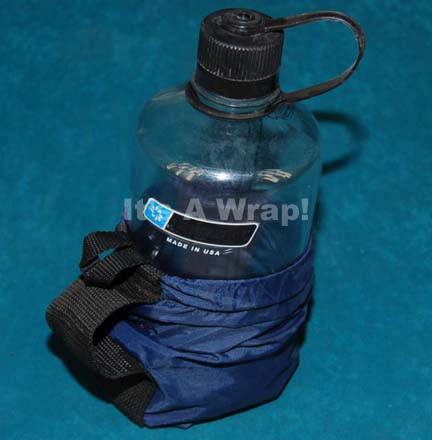 Description: A prop item like those featured in various episodes of Star Trek: Enterprise. This item is a clear plastic water bottle in a blue, waterproof covering that is cinched at the top to keep the bottle inside, has a black nylon strap with a belt loop, and attached, plastic screw on cap. The item has an approx. height of 9 inches and approx. diameter of 4 inches.