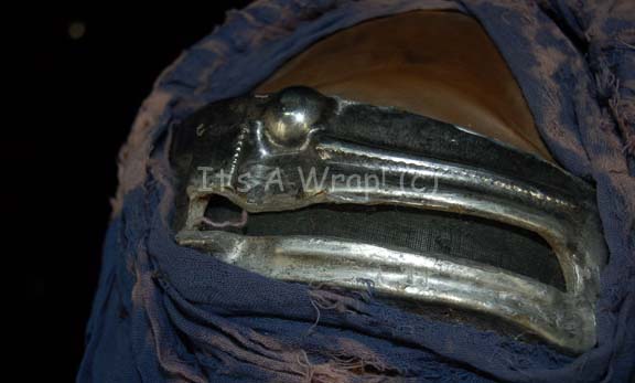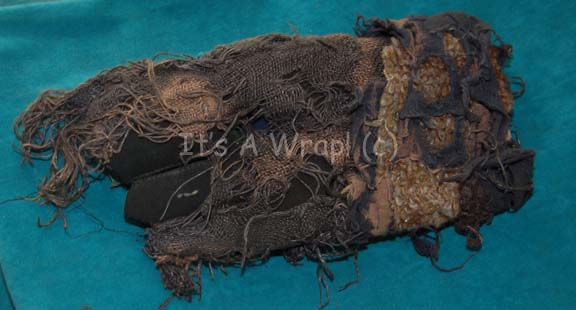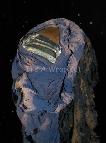 Description: A costume element featured in the second Star Trek feature film “The Wrath of Khan”. A head wrap composed of multiple strips of blue, gray, and black fabric bound together that completely covers the head and trails down the back, and a rubber and plastic ‘visor’ for the wearer to see out of. The item was intentionally distressed to appear as it was composed of found items and had been used for years on end.