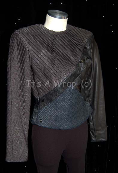 Description: A costume featured in the Star Trek: Voyager episode “Warlord”; wherein the consciousness of a tyrant named “Tiernan” (Leigh McCloskey) is transferred to “Kes” (Jennifer Lien) and begins to unlock her hidden mental powers. This costume is that of the Ilari woman “Nori” who was the spouse of “Tiernan” before he switched bodies, it consists of a long-sleeved, full-length, textured black jumpsuit like those that are used underneath some Borg or Romulan costumes, a long-sleeved, black jacket consisting of dark-gray, reflective, pleated material along the shoulders and down the right arm, sort, black leather along the left side of the abdomen and down the left arm, reflective vinyl accents across the front and back, and a diamond shaped pattern along the bottom. A sewn in Voyager tag in both reads ‘Galyn Gorg’ and a costumer’s tag restates this.