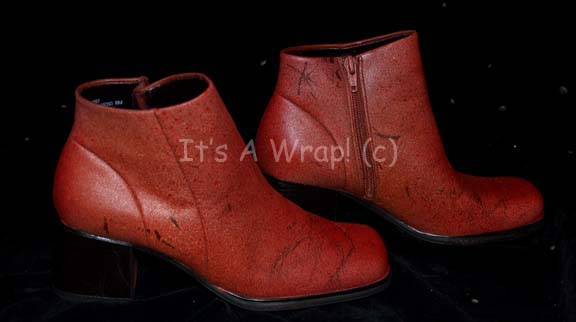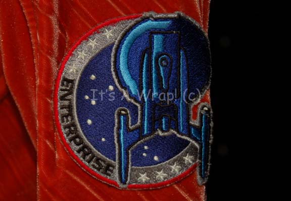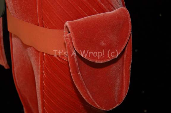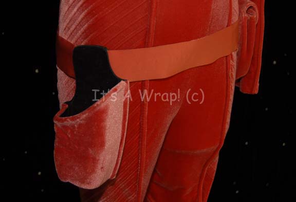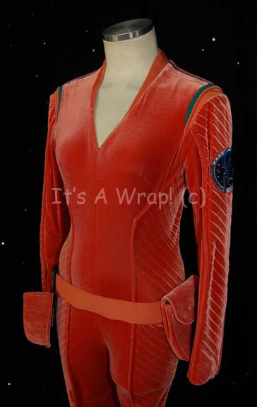 Description: A costume featured in various episodes of Star Trek: Enterprise but altered for use in “Twilight”. This costume is a long-sleeved, full-length, orange velvet jumpsuit featuring loose pleated detail down the sides and inner sleeves; an “Enterprise NX-01” patch on the left shoulder, blue green stripes around the shoulders, matching ankle boots, and two holsters, one soft vinyl and the other vacuum-formed plastic covered in the same orange velvet. A sewn in Enterprise tag denotes wear by Boni Yanagisawa, #60’.