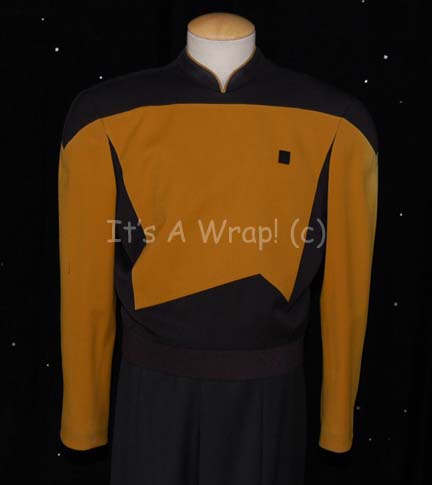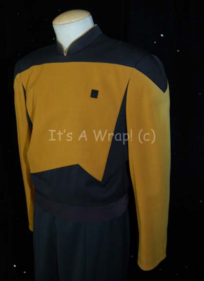 Description: A costume featured in various episodes of Star Trek: The Next Generation for wear by the regular stunt person for Brent Spiner, Brian Williams. This costume features a long-sleeved Starfleet uniform jacket with black shoulders, an Operations Gold chest, back, sleeves, and around the top of the Mandarin collar; black uniform trousers that end in stirrups. This particular uniform has a zip down the back of the costume and features a Velcro patch on the left breast for a commbadge (sold separately). An attached costumer’s tag reads ‘Stunt Dbl, Data, Brian Williams’.