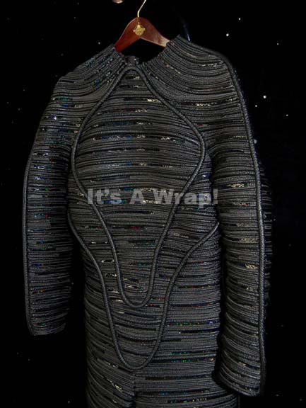 Description: A costume featured in the Star Trek: Enterprise episodes “Shockwave” and “Storm Front: Part II” for wear by Matt Winston as the 'more or less human' Temporal Agent “Daniels”. This costume is a long-sleeved, full-length, iridescent black, gray flecked, vinyl jumpsuit featuring horizontal piping across the entire garment meant to give a “ribbed appearance”. Further, multi-colored iridescent detail between the ‘ribs’, larger piping accent down the sleeves, legs, and in a vaguely circular shape outlining the chest area, and a zip down the back with a clasp at the top. A sewn in Enterprise tag reads ‘Mat Winston #26’, a costumer’s tag that reads ‘Enterprise, Daniels, Matt Winston, used in multiple episodes’ and a second costumer’s tag that reads ‘Enterprise episode #026, episode #078, Daniels, Matt Winston, multiple episodes’.