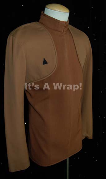Description: A lot of costume elements like those featured in various episodes of Star Trek: Deep Space Nine for wear by Bajoran security officers. This lot consists of a long-sleeved, brown, Bajoran security jacket with mustard-colored sleeves, a zip down the front, Velcro placement for a commbadge, and a molded-plastic Bajoran-style phaser holster with its own Velcro placement on the back and covered with fabric matching the jacket. Safety pins in the left cuff sleeve denote that either the sleeve was not finished or was waiting to be repaired. A sewn in Deep Space Nine tag was either left blank or has faded into illegibility but a costumer’s tag reads ‘DS9, Bajoran Security’.