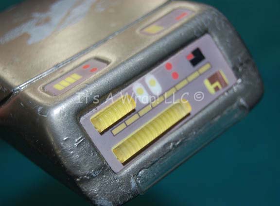 Description: A prop tricorder like those appearing variously in episodes of Star Trek: Voyager and Deep Space Nine. The item is made from molded rubber and painted metallic pewter with multi-colored graphical applications and embedded acrylic elements. The item is molded into a highly detailed, non-opening position and depicts a degree of damage in the form of removed paint from the removal of an adhesive strip on the face, as well as some slight dings and scratches. The item is perfect for an already existing tricorder holster, but check your item’s measurements against this items approx. 4 X 3 X 1.25 inches.