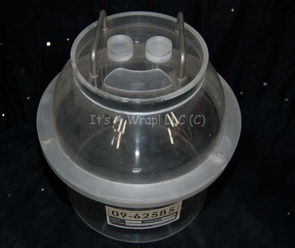Description: A mid-sized container appearing as set dressing in the sickbay set on Star Trek: Enterprise. The item is a clear acrylic container with a domed lid that features several raised elements to suggest hardware and a side mounted Starfleet inventory application. The item measures approx. 13.5 X 15.25 inches diameter.