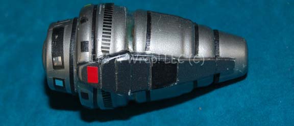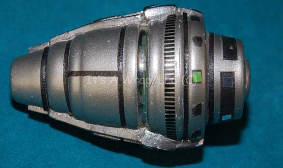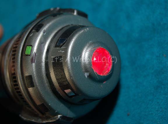 Description: A unique hand prop featured in the Star Trek: Deep Space Nine episodes “Things Past” and “Extreme Measures” for use by “Dr. Bashir” (Alexander Siddig). The item is metallic silver painted cast resin with a hollow core for a battery compartment and internal electronics. The item features a series of green LEDs that light in sequence when a button on the side is pressed, this also activates a red flashing light on the end. The item is powered by two DL2025 sized 3volt batteries and measures approx. 3.25 X 1.75 inches diameter.
