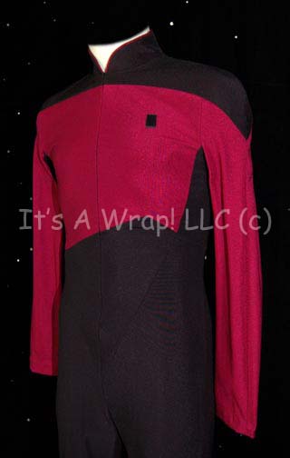 Description: A Starfleet uniform made in the style of Star Trek: The Next Generation featuring the black shoulders with a command red chest and back and black waist and legs that end in stirrups. This style also exhibits the Mandarin collar common to cast members during and after the third season which features red piping along the top of the collar. This particular uniform has zips that close the front of the costume and features a Velcro patch on the left breast for a commbadge (sold separately). This costume was reused in the finale of Star Trek: Enterprise. “These are the Voyages…”, features a sewn in tag reads ’29, 292’, denoting it as size 29, and a sewn in Enterprise tag on top of the first reads ‘Brian Brorby’.