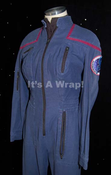 Description: A costume featured in various episodes of Star Trek: Enterprise. This Starfleet uniform jumpsuit includes the famous ‘Enterprise NX-01’ left shoulder patch with Operations red division strips around the shoulders. “Enterprise” costumes feature multiple zippered pockets, Velcro size adjustments and zippers at the wrists and ankles, come with detachable shoulder pads, and a black, button up, sleeveless undershirt. There is very minor fading on the shoulders of the jumpsuit. A sewn in Enterprise tag in both items reads Kyla Kuhner’ and a costumer’s tag restates this.