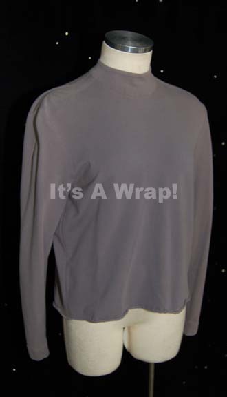 Description: A costume element featured in various episodes of Star Trek: Voyager for wear by Kate Mulgrew as “Captain Kathryn Janeway”. This item is a blue-gray, long-sleeved, Starfleet uniform shirt with a zip up the back and a sewn in Voyager tag that reads ‘Kate Mulgrew’.