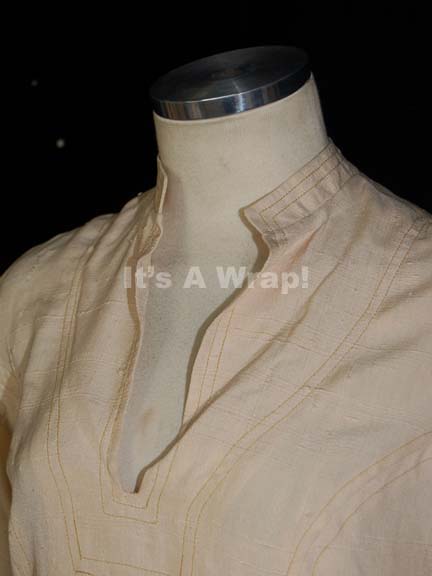 Description: A costume element featured in the first Star Trek feature film. This item is a long-sleeved, off-white linen shirt, featuring yellow-thread accents, a v-shaped neckline, and a sewn in Paramount tag that reads ‘Sharon Hesky’.