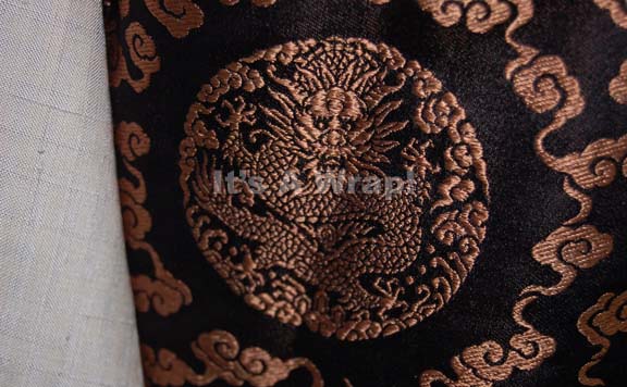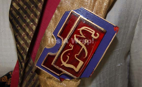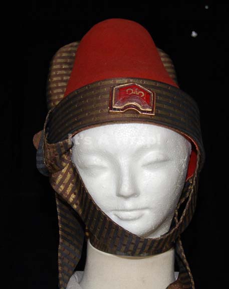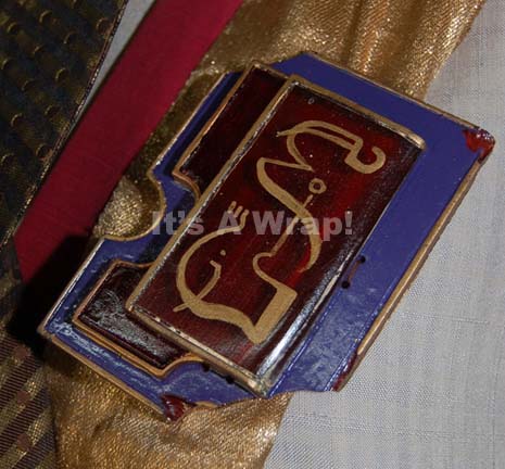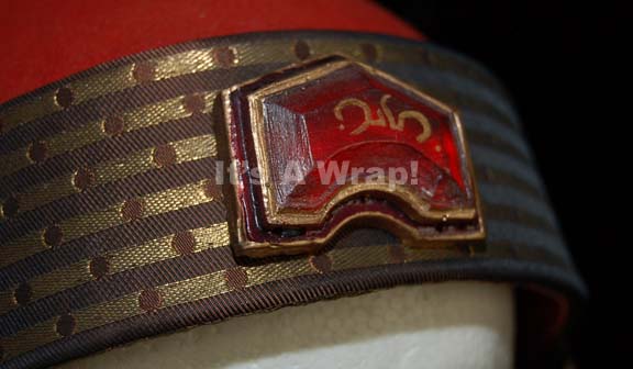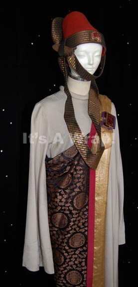 Description: A costume like those featured in various Star Trek feature films and episodic television. This costume consists of a long-sleeved, full-length, blue-gray robe with a raised collar and loose, pleated, sleeves; an over the shoulder, black, silk-like sash featuring a beautiful copper-colored dragon motif. A wide, reflective gold stripe over the shoulder, a smaller red stripe on the left, and red faux jewel featuring a Vulcan iconographic symbol in the center. Included is a rust-colored, Vulcan-style hat featuring accent trim in metallic-gold and brown stripe or ‘brick’ pattern, chinstrap, second accent strap that drapes across the chest and red faux jewel with similar symbol. A sewn in Paramount tag reads ‘7-4’ and a label reading ‘Evens Riccardi’ is almost covering the tag.