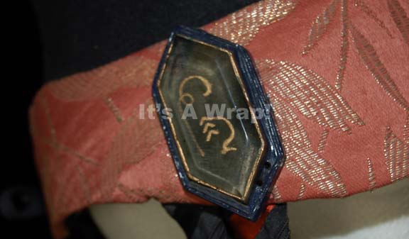 Description: A costume element similar to those featured in various Star Trek feature films. This item is a black felt hat in the Vulcan-style, featuring peach-colored trim, reflective gold-colored floral accents, a black and rust-colored chin strap, and a hexagonal faux jewel on the side with Vulcan iconographic symbol. A sewn in Paramount tag reads ‘3-15’.