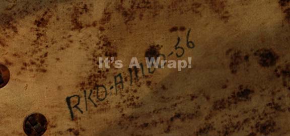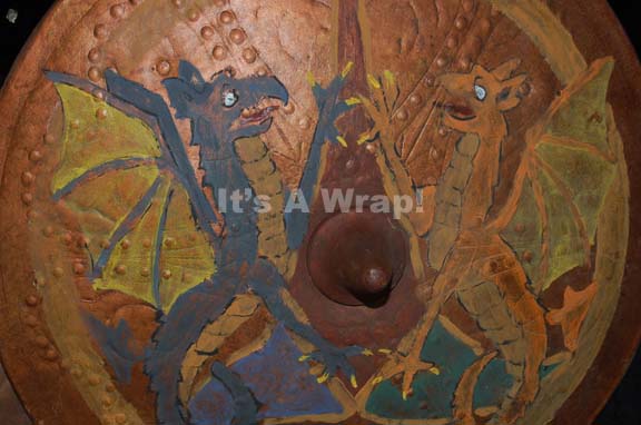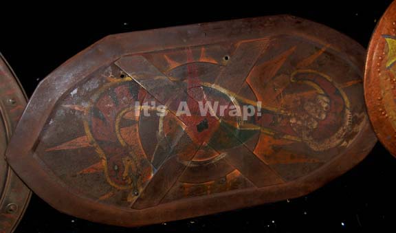 Description: A lot of four shield set dressings featured in various episodes of Star Trek episodic television. This lot consists of four shields; the first one is a round, metal shield featuring round, raised accents around the outside, raised stripes at various spots around the circumference, the Klingon symbol painted in the middle and fragile, vintage leather lining the shield and cracked, brown leather handles. The second shield is distressed, rounded diamond shape with a raised circle in the middle of an "X" and a snake figure painted on it; according to continuity guides, both shields were featured as set dressing in the Star Trek: Enterprise episode "Bounty". The third shield is smaller, is worn brown leather wrapped around a wooden core, features a dragon design painted on it, textured pattern of hearts around the circumference, a pointed knob in the middle, vintage leather lining with one brown leather handle. The last item is a buckler more than a shield of black wood, metal triangles around the outside and metal, star-shaped accents. The reverse features a hand written inscription 'RKO' referring to the vintage production company RKO Radio Pictures. The first shield has an approx. diameter of 25 inches, the second approx. 35 X 17 inches, the third approx. diameter of 18 inches and the last a diameter of approx. 12 inches. All three items feature the tri-color Klingon Empire trefoil emblem painted on the face of them.