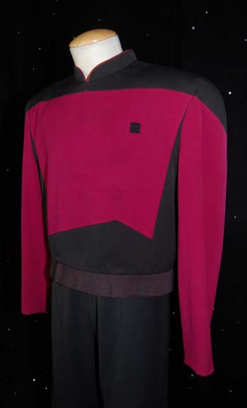 Description: A costume featured in various episodes of Star Trek: The Next Generation. This costume is a variant on the Starfleet uniform jumpsuit in that it is split into a two items; a long-sleeved, black uniform jacket featuring Command Red chest, back, sleeves, and piping around the Mandarin collar, a Velcro placement for a commbadge (not included), black overall-style trousers, and black leather, size 12, ankle boots. A sewn in Paramount tag in the jacket has a name inscribed but is illegible and a sewn in Star Trek VII tag on the trousers reads ‘Mark Gerroux’ which could be what is on the jacket as well.