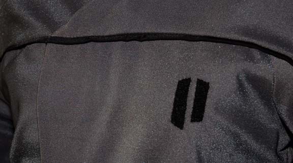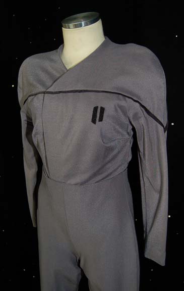 Description: A full–length gray Starfleet uniform jumpsuit made in the style of “All Good Things…”, the final episode of Star Trek: The Next Generation, to exhibit the future styling of Starfleet uniforms. This costume was featured in the final episode of Star Trek: Voyager, “Endgame”. It features black elastic stirrups at the feet, zips up the spine and clasps at the neck, a line of black piping around the shoulders, a double breasted appearance in the front and a Velcro placement on the left breast for a future-style commbadge (not included), and a flesh colored, undergarment sewn into the garment. A sewn in ‘MUTO Little, Los Angeles’ tag and a second tag reads ‘Jessica Kanan’.