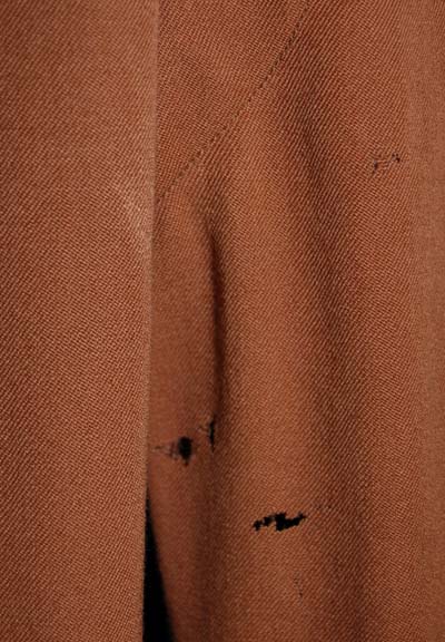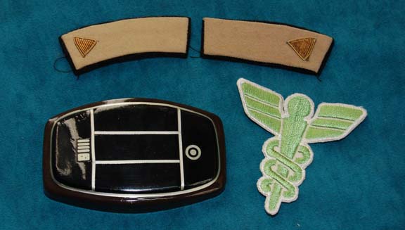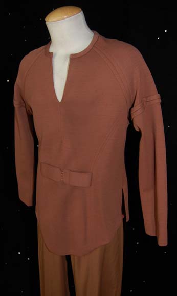 Description: A costume like those featured in the first Star Trek feature film. This costume consists of a brown, Class-B Starfleet uniform shirt and trousers and the following unattached accoutrements; medical green shoulder divisions strips with petty officer rank, large green caduceus patch, and unfilled, male bio-monitor. The trousers have three small holes high on the left leg.