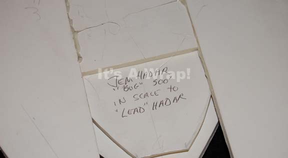 Description: A camera test model created for use during production of episodes of Star Trek: Deep Space Nine. The item is a white foam core fashioned Jem’Hadar attack ship made from adhered elements measuring approx. 13.5 X 13 X 2 inches with an inscription on the dorsal side reading ‘Jem Hadar “Bug” 500’ in scale to “Lead” Hadar’.