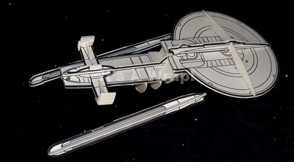 Description: A camera test model created for use during production of episodes of Star Trek: The Next Generation and Deep Space Nine. The item is a white foam core mock-up of an Excelsior-Class ship with an expanded photocopy detail adhered to the dorsal side and detached warp nacelles. The item measures approx. 34 X 18 X 8 inches and the nacelles measure approx. 23 X 2.5 X 2 inches.