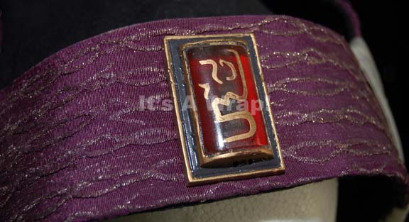 Description: A costume element similar to those featured in various Star Trek feature films. A black felt hat in the Vulcan-style featuring a wide, violet trim around the bottom with stylized ‘ears’ on the sides, a reflective silver-colored lattice-work accent along the trim, a matching accent in the back, a gray chinstrap tied onto the ‘ears’, and red, rectangular, faux jewel with Vulcan iconographic symbol. A sewn in Paramount tag reads ‘4-9M’.