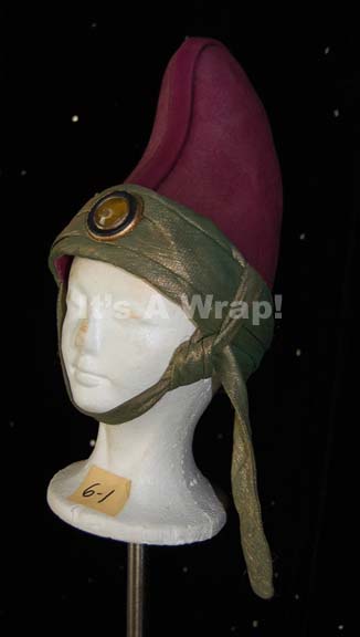 Description: A costume element similar to those featured in various Star Trek feature films. A magenta-colored, Vulcan-style, felt hat featuring metallic-gold trim with a green tinge that also forms a chinstrap; a round, yellow faux jewel in the front with Vulcan iconographic symbol in the middle and dark-blue trim. A sewn in Paramount tag reads ‘6-1’.